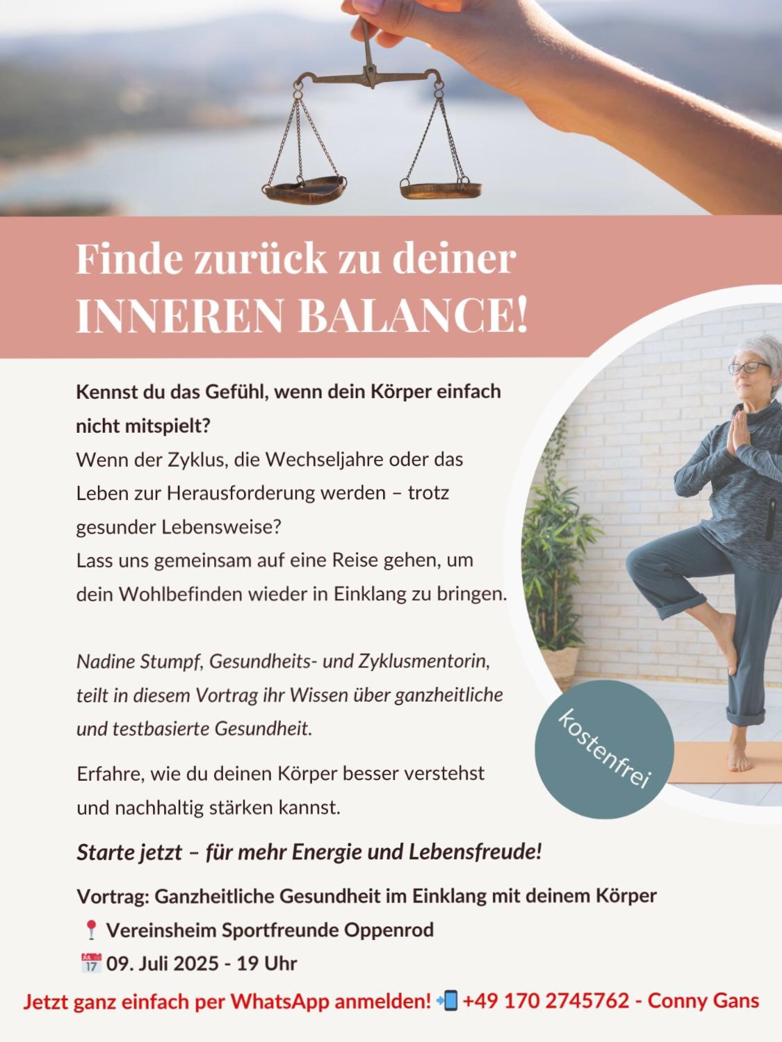 Die Sportfreunde 1910 Oppenrod e.V. laden hiermit herzlich zur Teilnahme am Vortrag „ganzheitliche Gesundheit- im Einklang mit deinem Körper“ am 09.07.2025, um 19.00 Uhr, in das Vereinsheim der Sportfreunde Oppenrod ein.